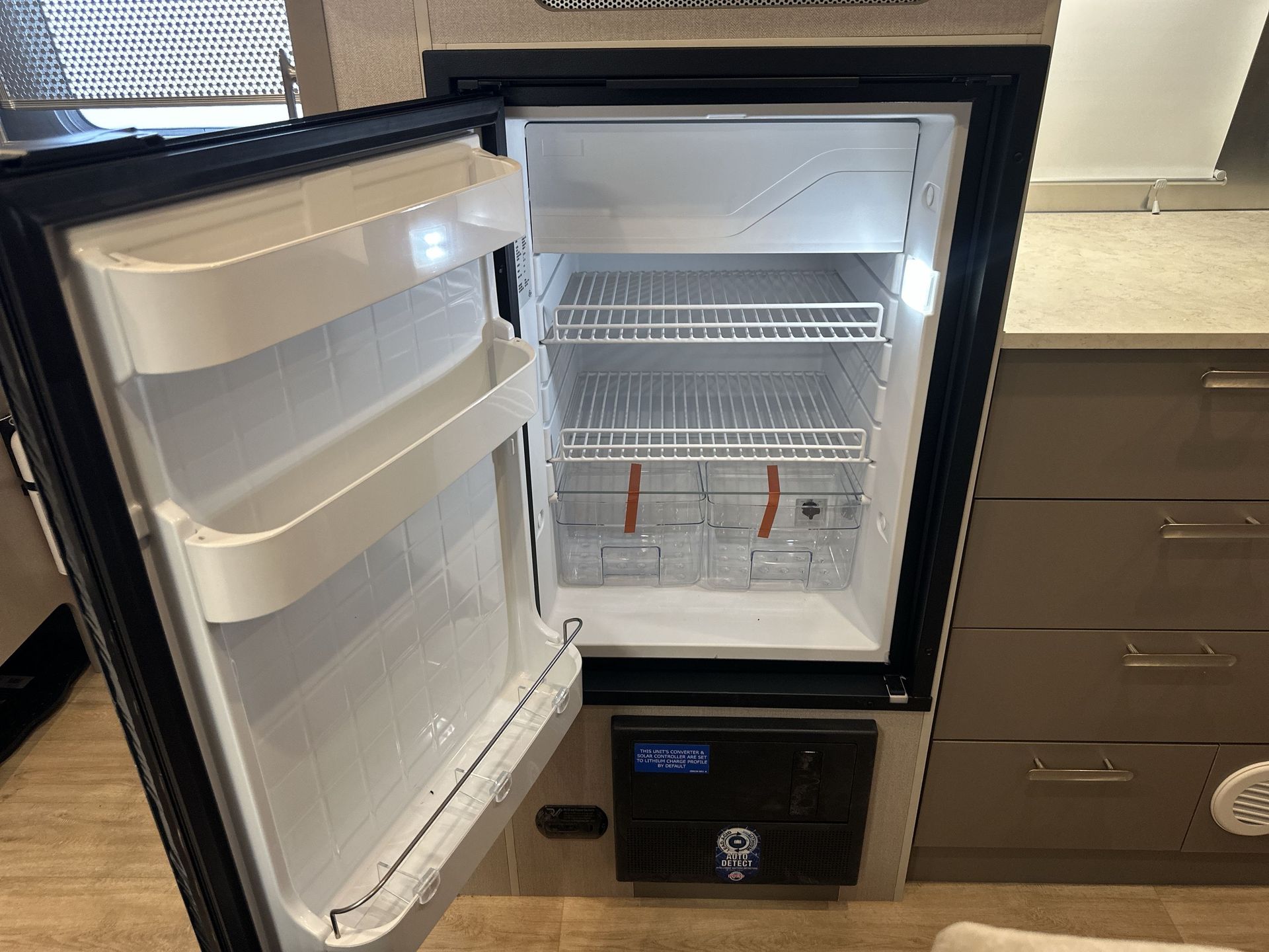 The bathroom, located at the rear, includes a spacious shower, a plastic toilet, and sufficient storage for toiletries and towels. With vinyl flooring throughout, cleaning is a breeze, allowing more time to enjoy your travels.