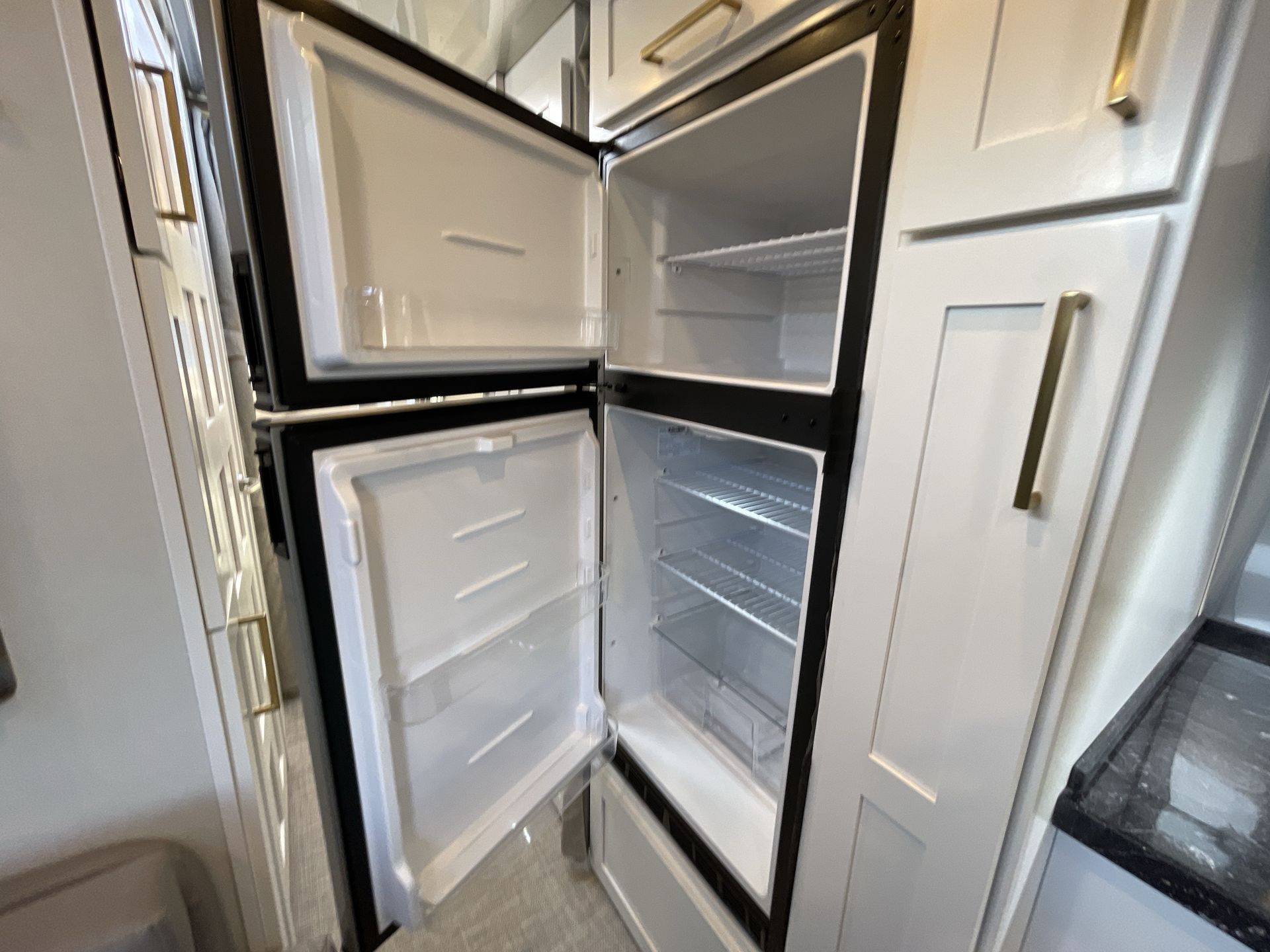 The living area is designed for comfort and functionality, featuring a powered lounge sofa with reclining seats that can also serve as an extra sleeping space. A dedicated dining area with a powered dinette comfortably seats four and can be converted into an additional sleeping area with the push of a button. Large panoramic windows fill the space with natural light and offer stunning views of your surroundings.