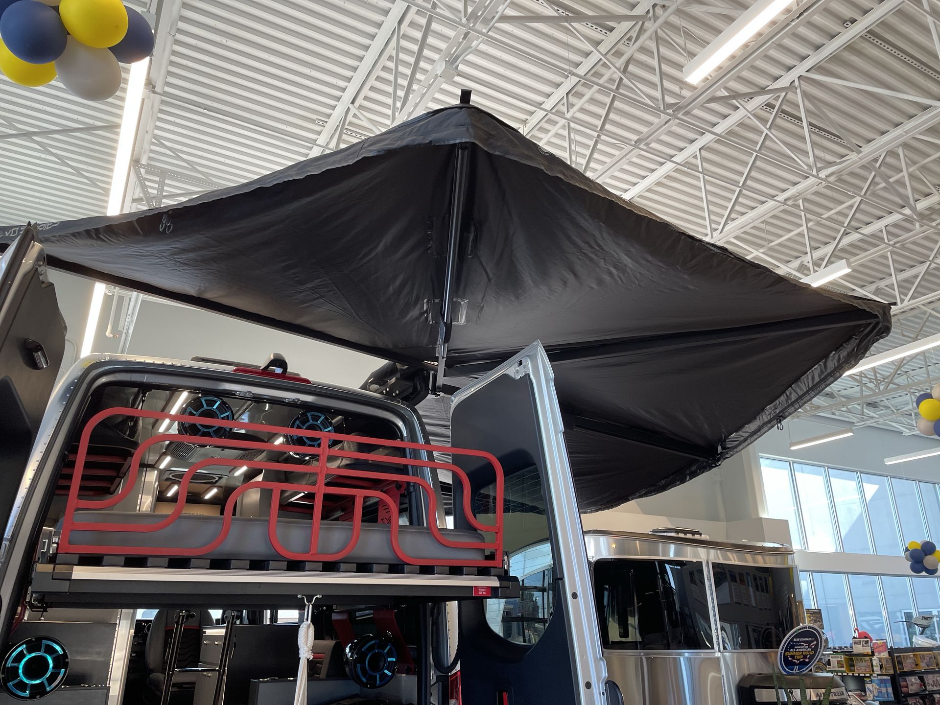 The exterior features 18-inch wheels and a 2-inch suspension lift, providing enhanced off-road performance. A durable black protective coating shields the lower body and hood, while a Tenzing Trailhead brush guard with integrated LED light bars ensures visibility on any terrain. The 270-degree wrap-around awning, made from 320-gram ripstop material, extends your living space and includes integrated LED lighting for nighttime ambiance.
