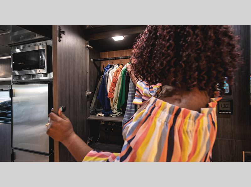 The coach is built on a Mercedes-Benz Sprinter van chassis, and includes active safety systems that automatically provide additional safety on the road such as active brake assist, driver attention assist, and active distance assist, distronic plus. The interior offers a cockpit with advanced in-dash technology and heated, swivel driver/passenger seats, plus the lavatory provides a stand-alone, corner shower with teak wall inlay, a Kohler faucet, shower head and sink, and a riveted aluminum porthole door.
